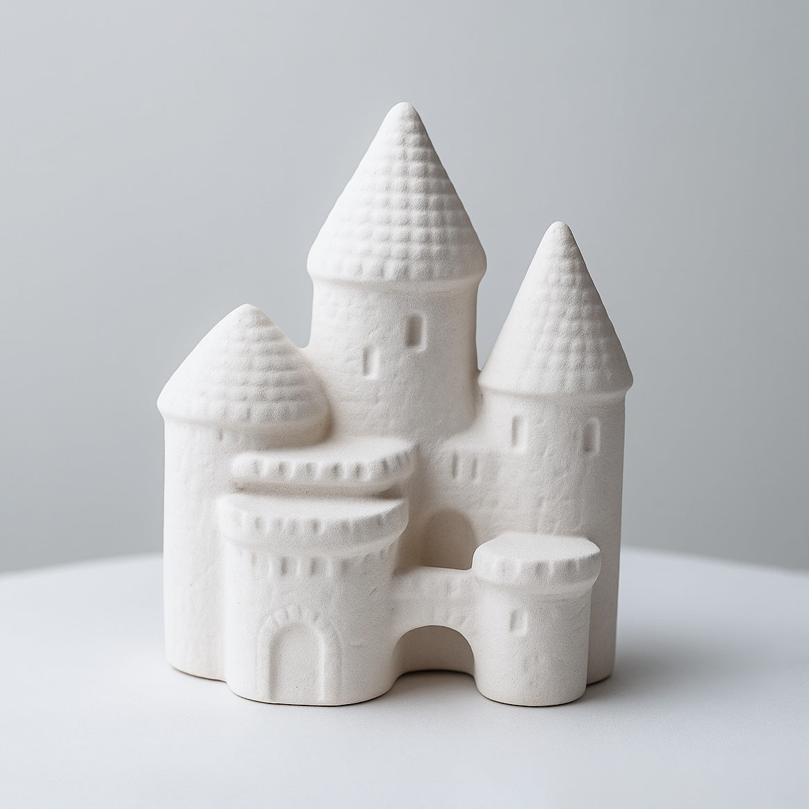 A soft-edged, storybook castle rendered in smooth white earthenware bisque. Its rounded towers, tapered turrets, and carved stone details arrive paint-ready, firing-ready, and ideal for both simple washes and layered decorative work. Finish quickly with acrylics and seal for décor, or use underglaze and clear glaze for a glossy, kiln-refired finish. A charming centrepiece for shelves, kids’ rooms, or whimsical fairy-tale displays.