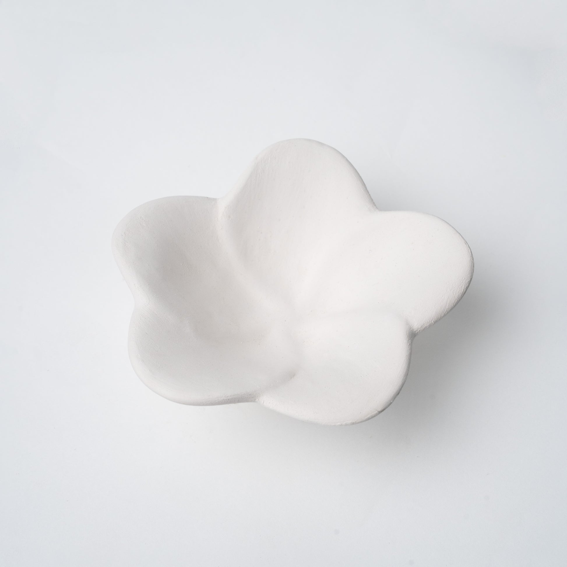 A softly sculpted bisque dish shaped like an open flower, with five rounded petals that rise gently from a shallow well. The organic curves invite colour washes, ombré blends and fine linework—perfect for floral motifs, gilded rims or minimal glazing—and it’s just the right size for jewellery, trinkets, or sauces.