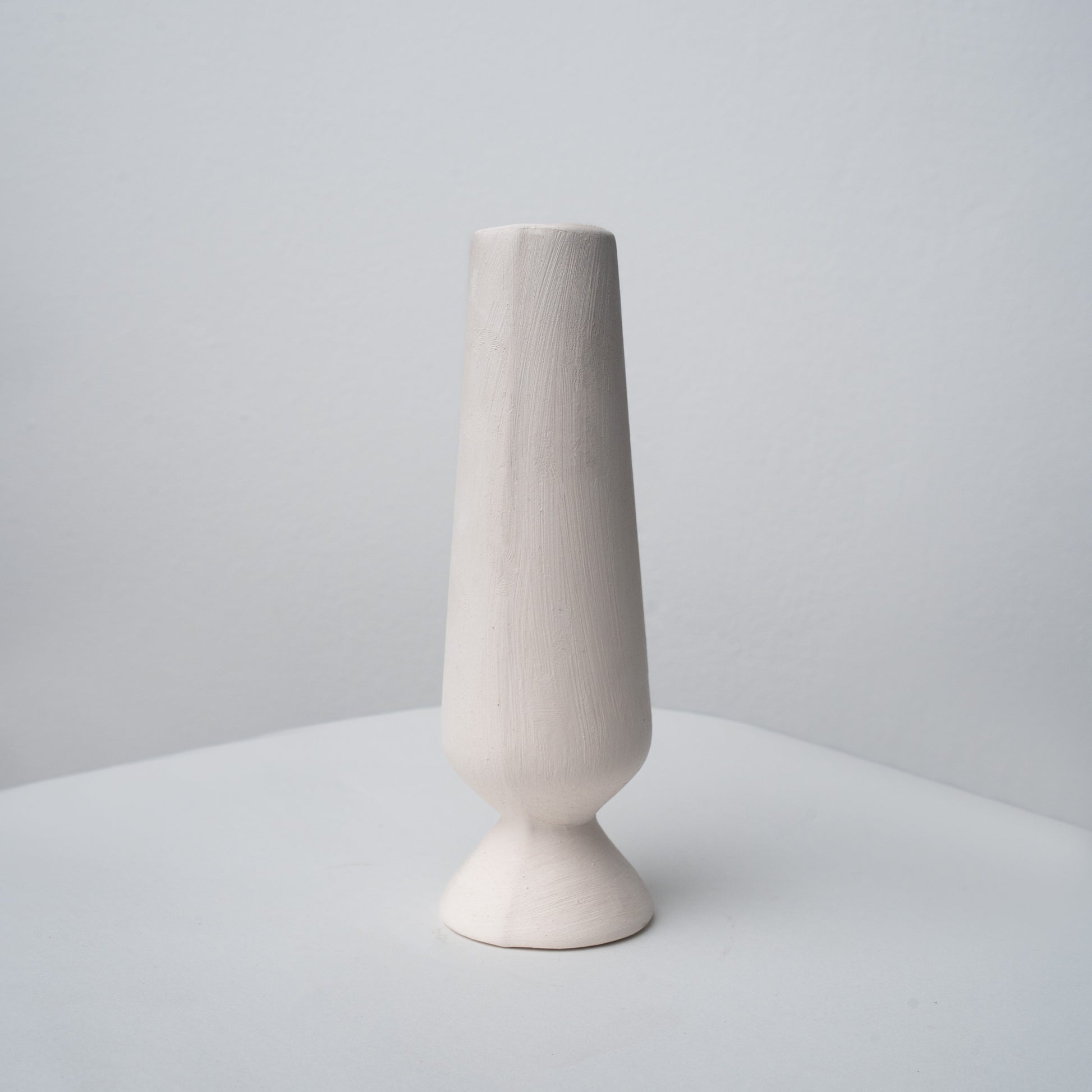 A modern pedestal vase with a straight, tapered column rising from a small foot—sleek, balanced, and perfect for a few stems or a single bold bloom. The smooth bisque surface is wonderfully paint-ready for vertical stripes, colour blocks, gradients, or minimalist glazing, bringing sculptural height to shelves and tables.