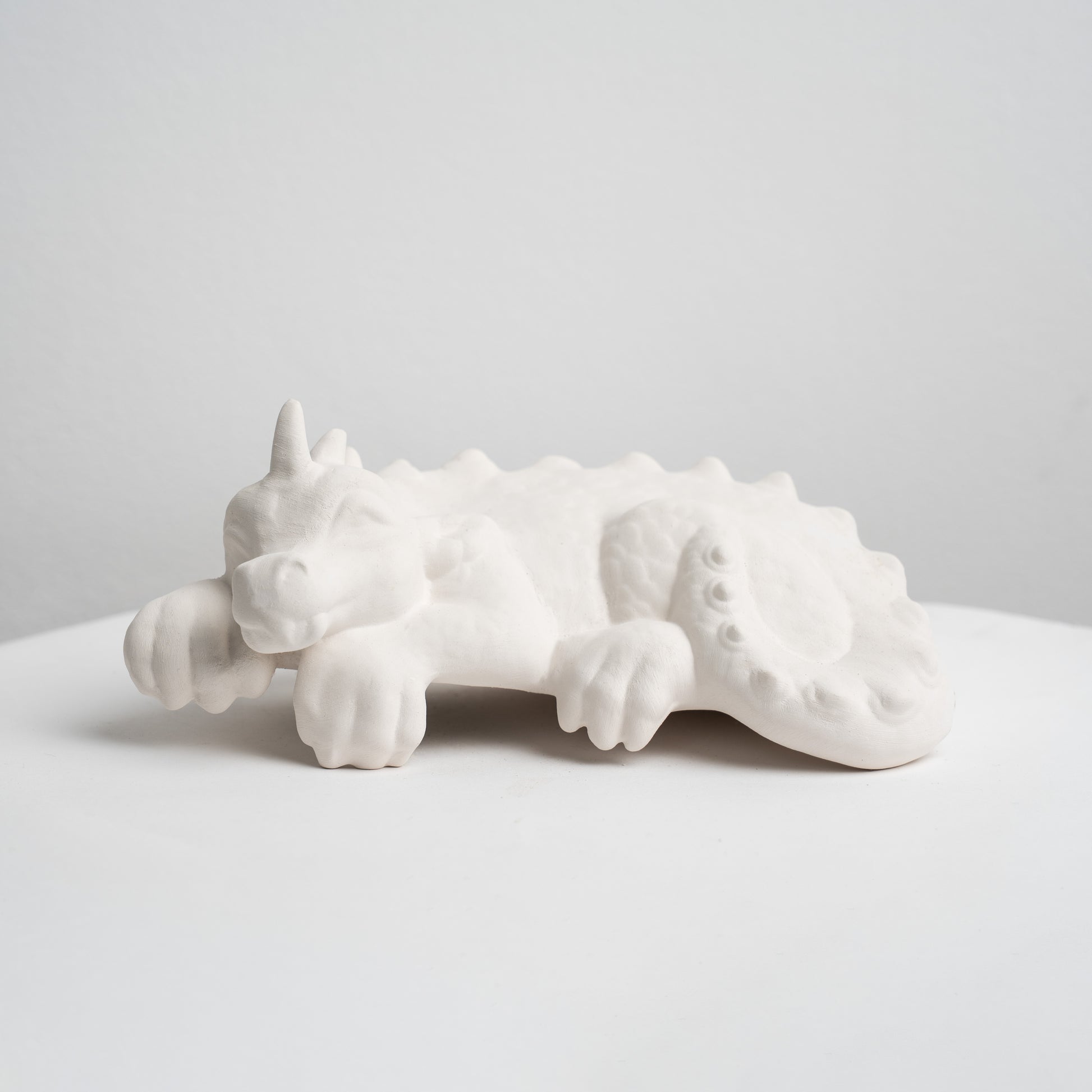 A relaxed bisque dragon curled up for a nap, with soft facial features, tiny horns and a ridge of rounded spines along a scaled back and tail. Low, stable and shelf-friendly, it’s a joy to paint: dry-brush to highlight the texture, layer washes for depth, add metallic pops on the horns and spines, or keep it matte for a storybook look—beginner friendly for studios, parties and craft nights.