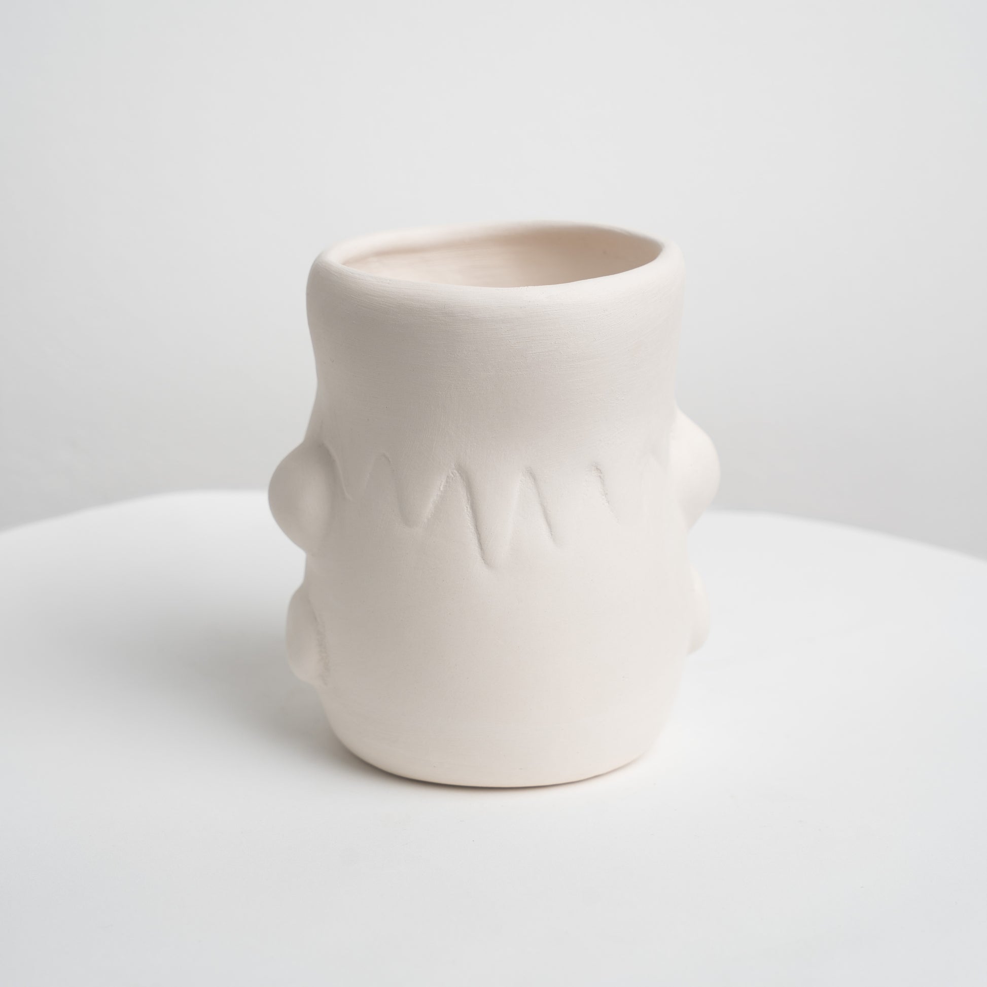 A chunky bisque planter with a friendly “Frankie” monster face—bold brow, rounded nose and a zig-zag hairline with side nubs. The smooth matte surface is super paintable: go classic green with stitches, try colour blocking, or dry-brush to pop the sculpted details. Fits a small succulent or plastic nursery pot; also great as a brush or pencil caddy. Studio-friendly and beginner-approved.