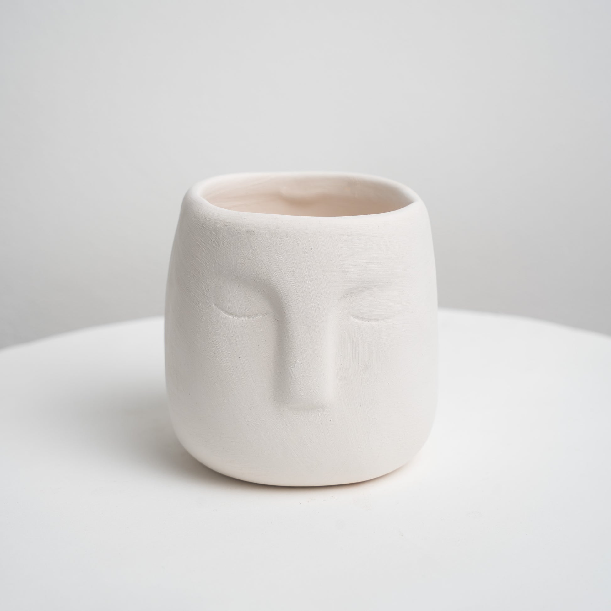 A rounded bisque planter with a calm, closed-eye face and softly defined nose. The smooth rim and matte surface make an easy canvas for washes, linework, speckles or bold colour blocks—add blush cheeks, lashes or graphic patterns with confidence. Perfect for a small succulent, dried stems or as a tidy for brushes and pens; beginner-friendly and studio-ready.